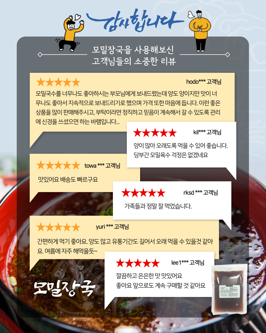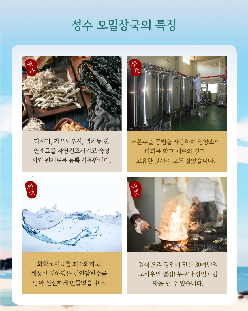 성수 모밀장국 1.8L 10,100원 이벤트 이벤트 첨가물 없이 12시간 정성스럽게 고아낸 한우사골곰탕 600g x 10개 58,900원 이벤트 이벤트 함초메주된장+양파참쌀고추장 34,000원 이벤트 이벤트